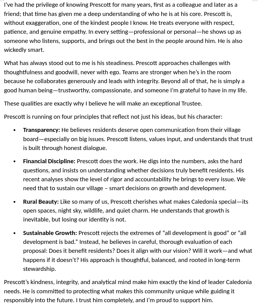 “Prescott brings the steady, thoughtful leadership Caledonia needs. He will make sure Village resources are used wisely and responsibly to support the character of—and quality of life in—the Village. I’ve worked alongside him in volunteer organizations and can personally vouch for his dedication and strong work ethic.